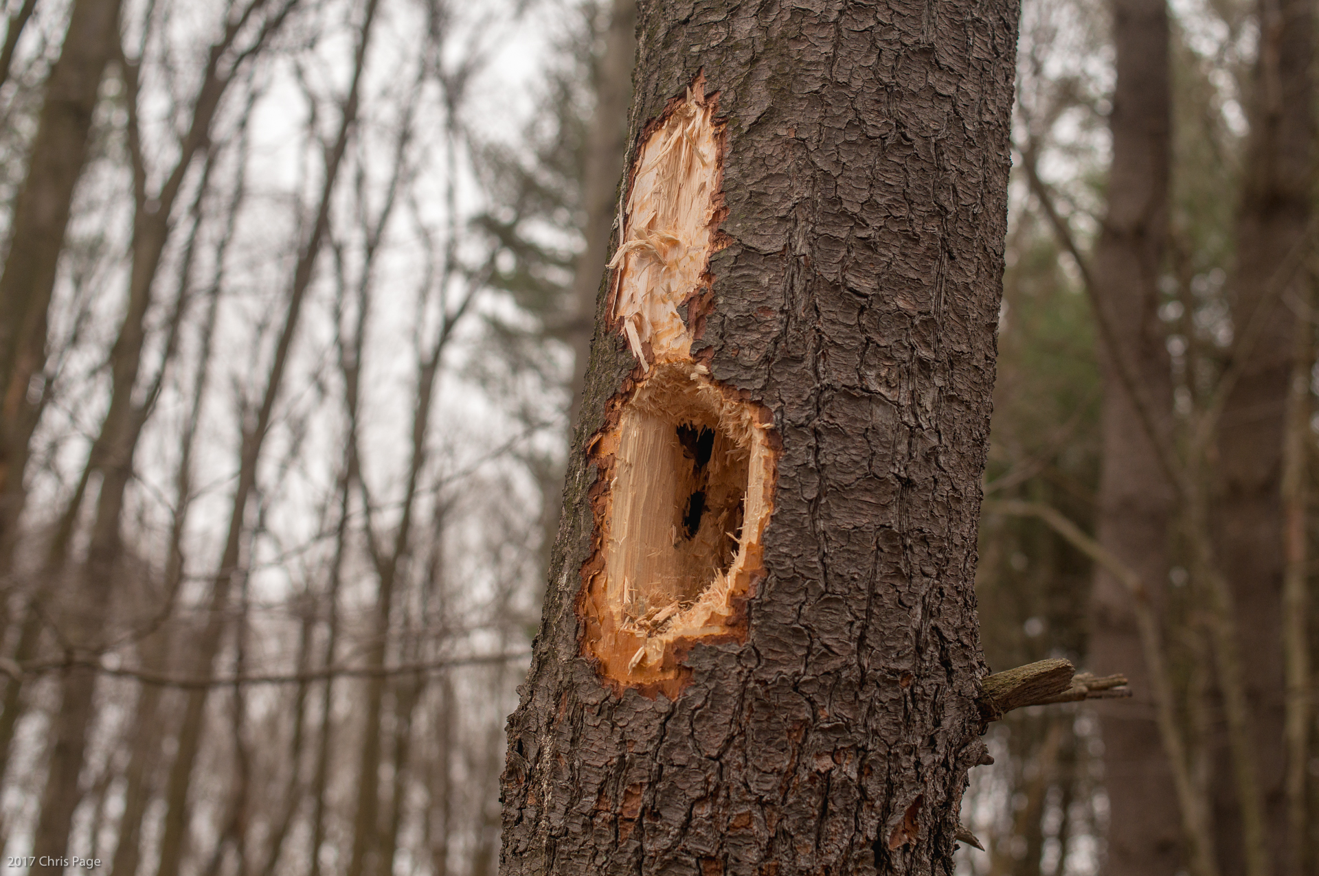 I came across evidence of recent Pileated Woodpecker activity. After returning to the studio I realized these photographs reveal a simple number sequence of one then two holes. I find a strange satisfaction in contemplating simple numbers.